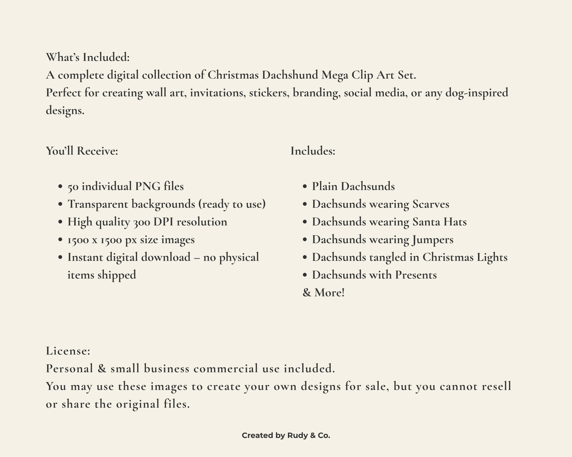 You’ll receive 50 high-quality watercolour PNGs featuring adorable dachshunds in Santa hats, sweaters, sleighs, tangled lights, gifts, cookies and more.