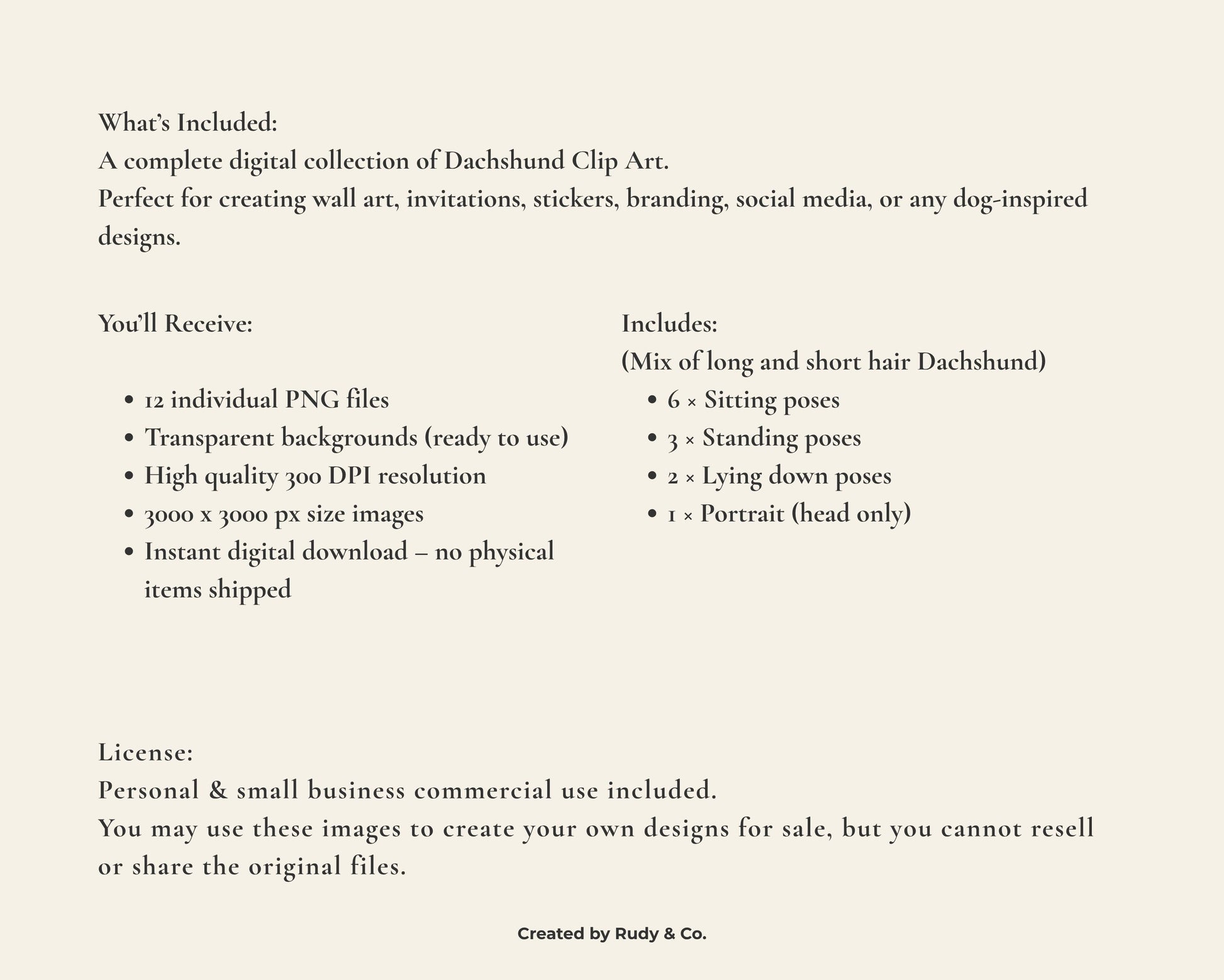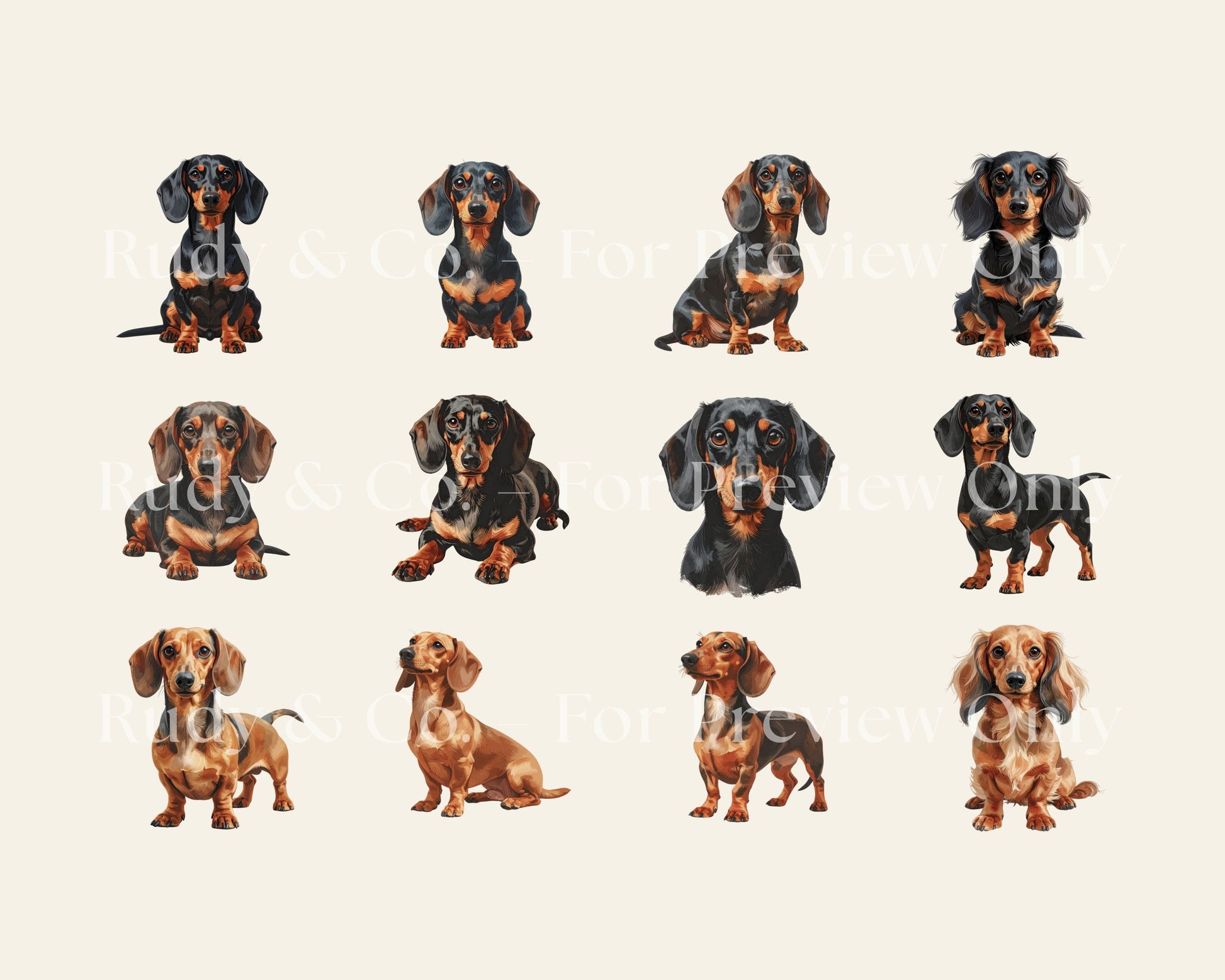 You’ll receive 12 high-quality PNG files (300 DPI, transparent background) featuring black & tan, cream, and long- and short-haired Dachshunds in a variety of adorable poses — sitting, standing, laying, side view, and portrait.