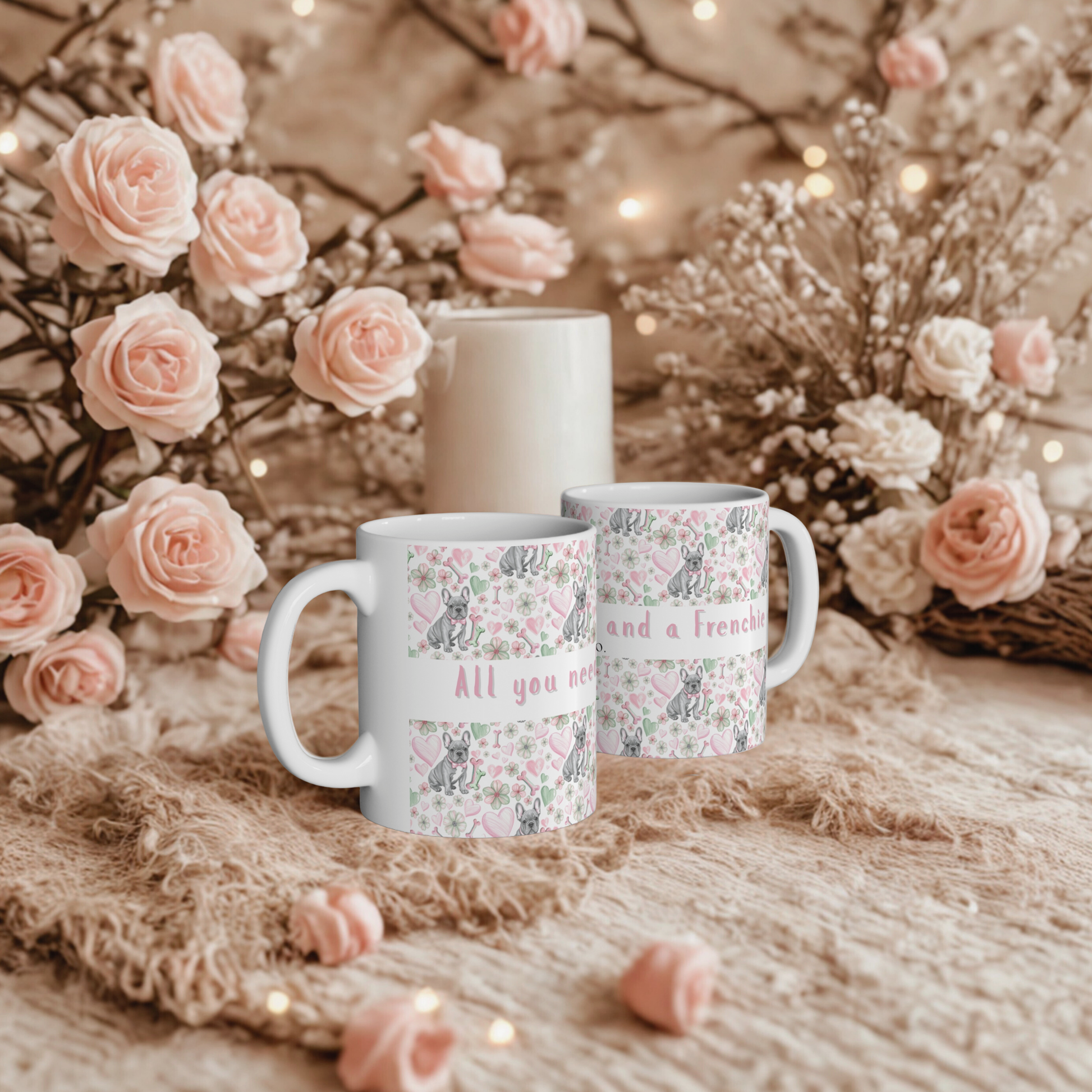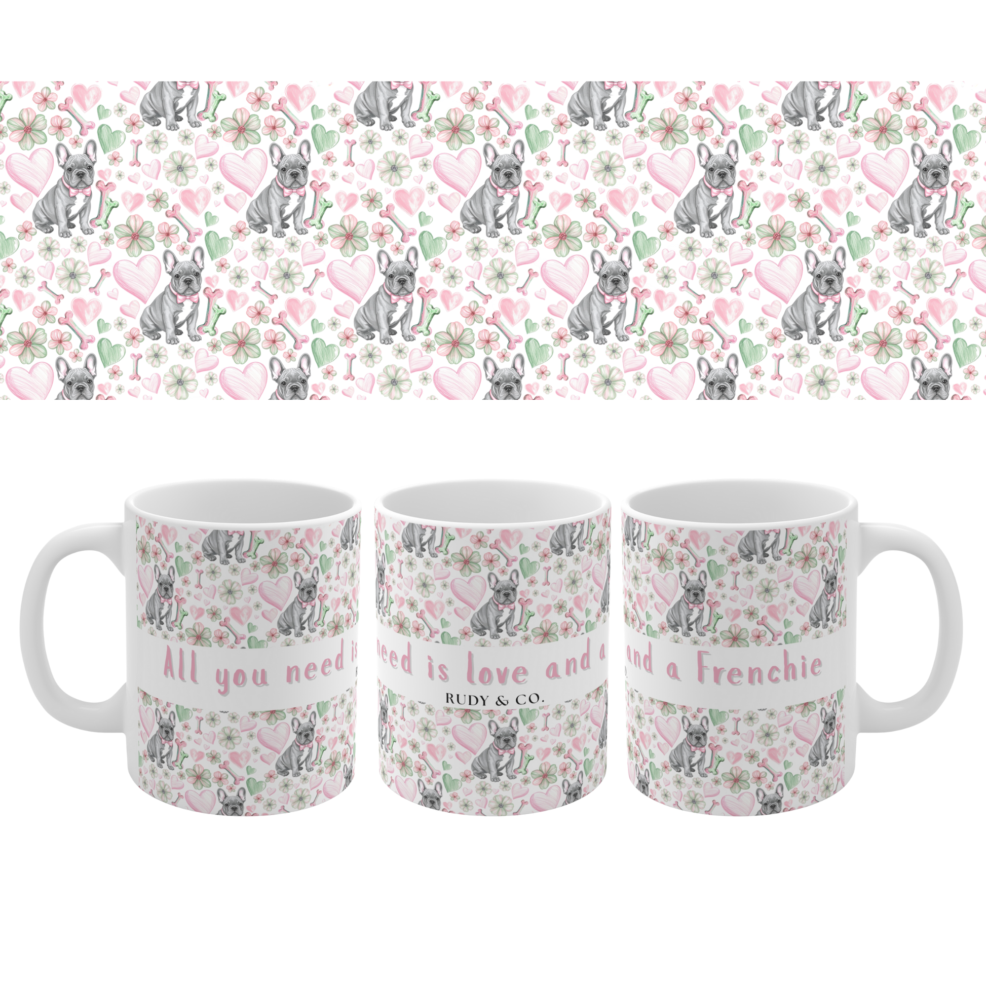 A soft Valentine’s mug featuring a hand-drawn style French Bulldog and the quote ‘All you need is love and a Frenchie.’