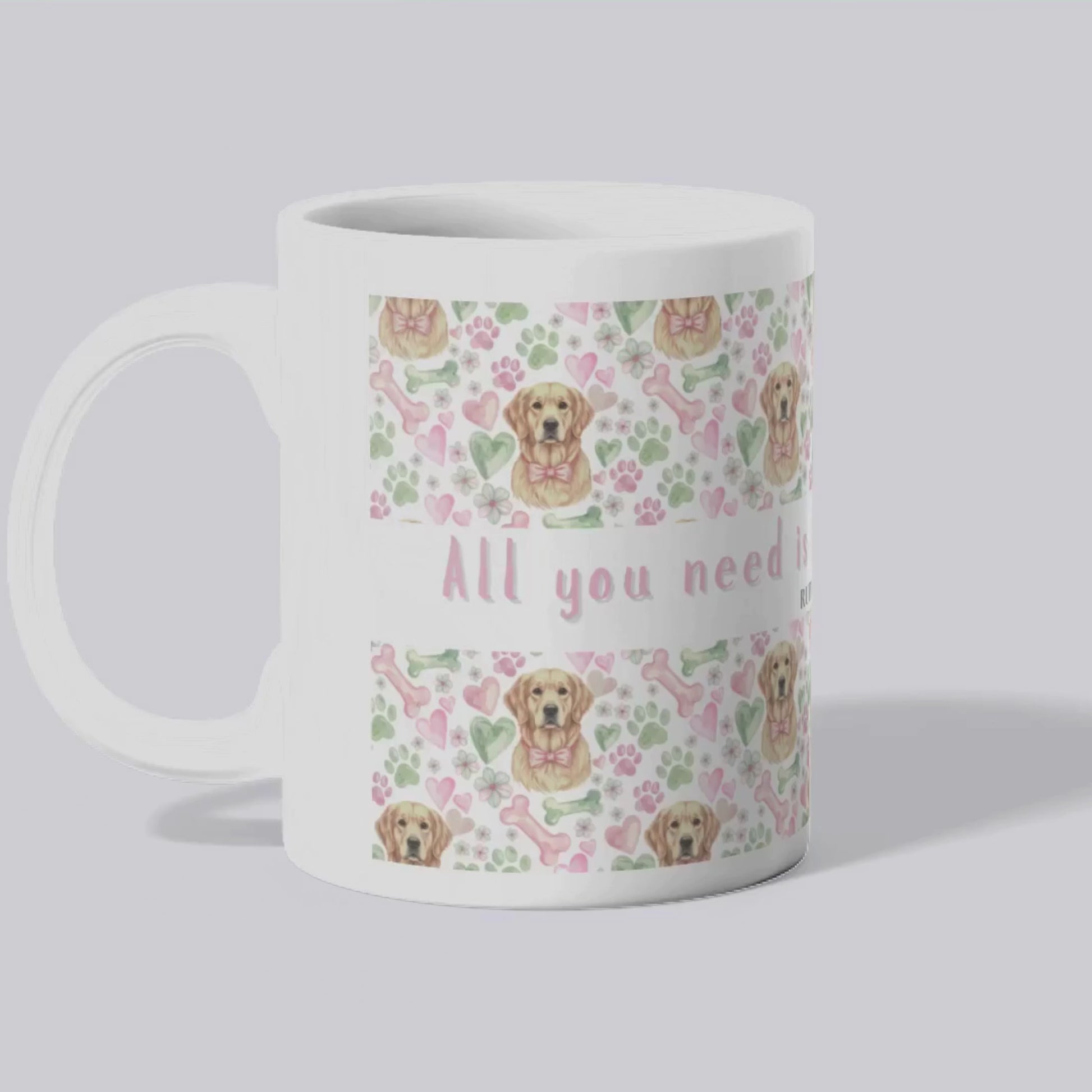 A soft Valentine’s mug featuring a hand-drawn style Golden Retriever and the quote ‘All you need is love and a Golden Retriever.’