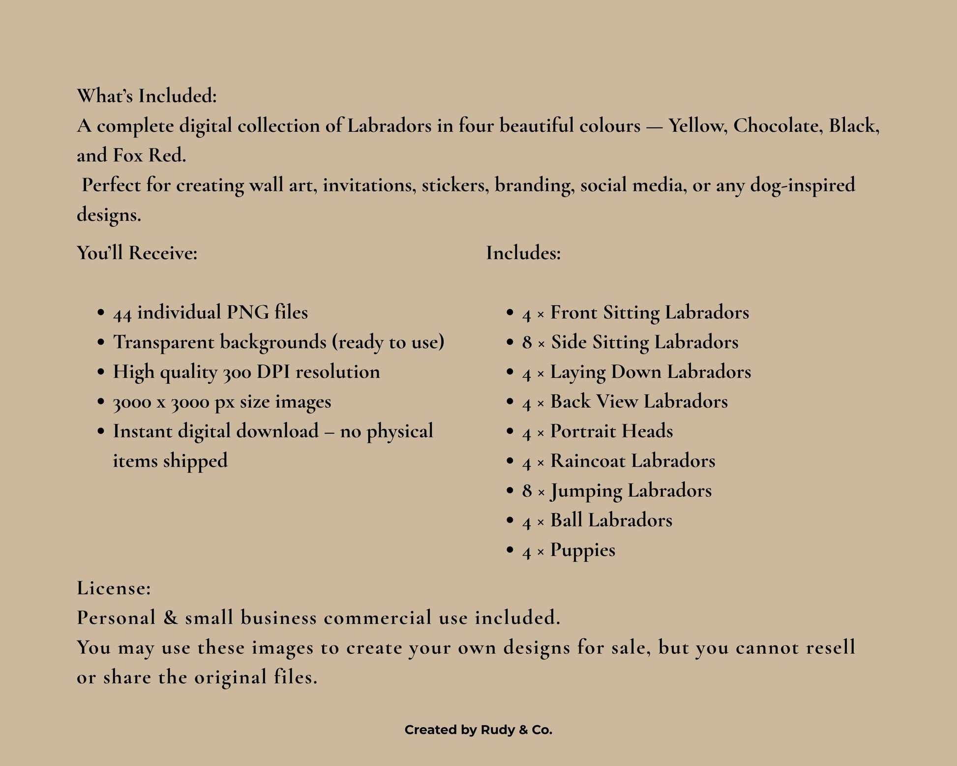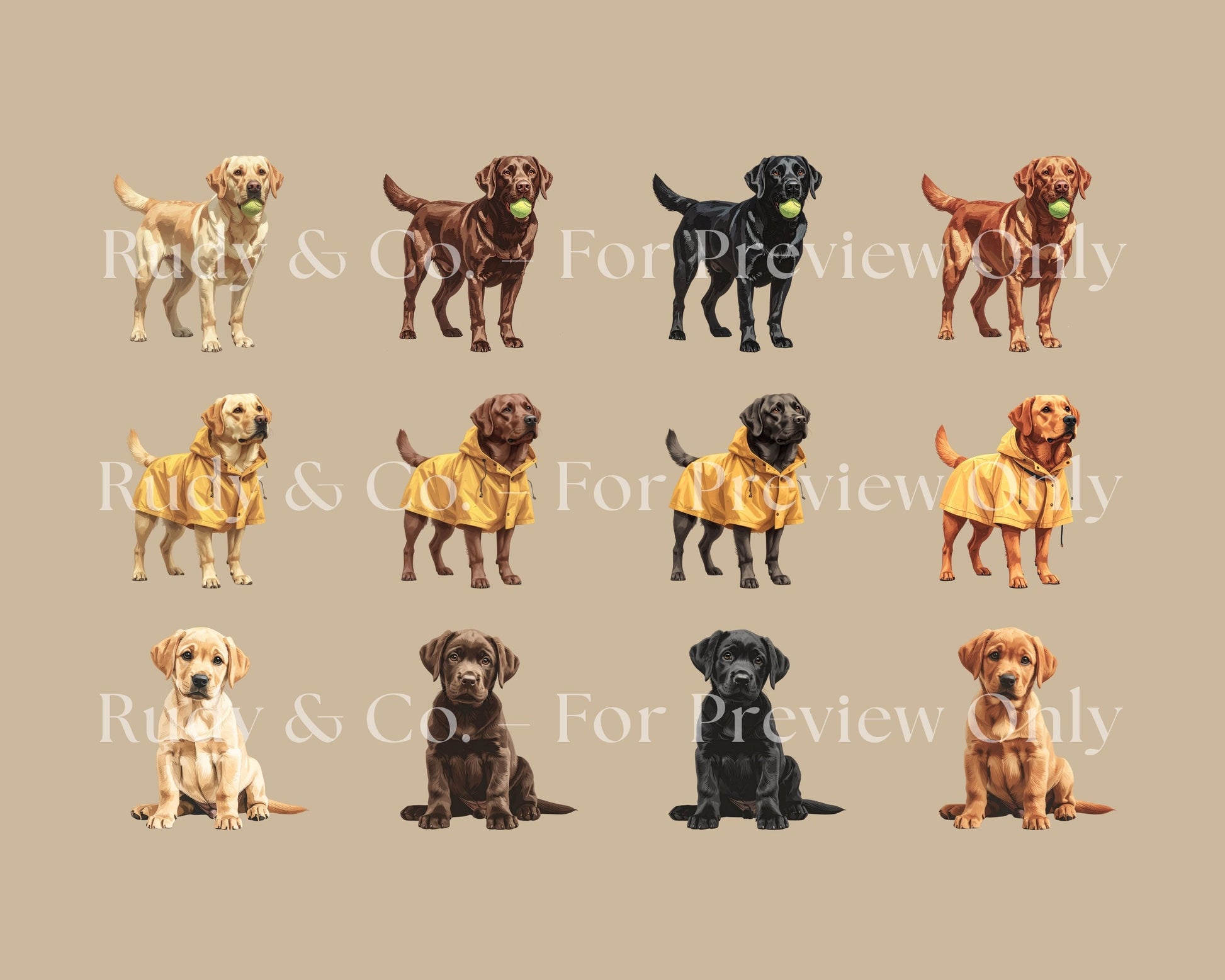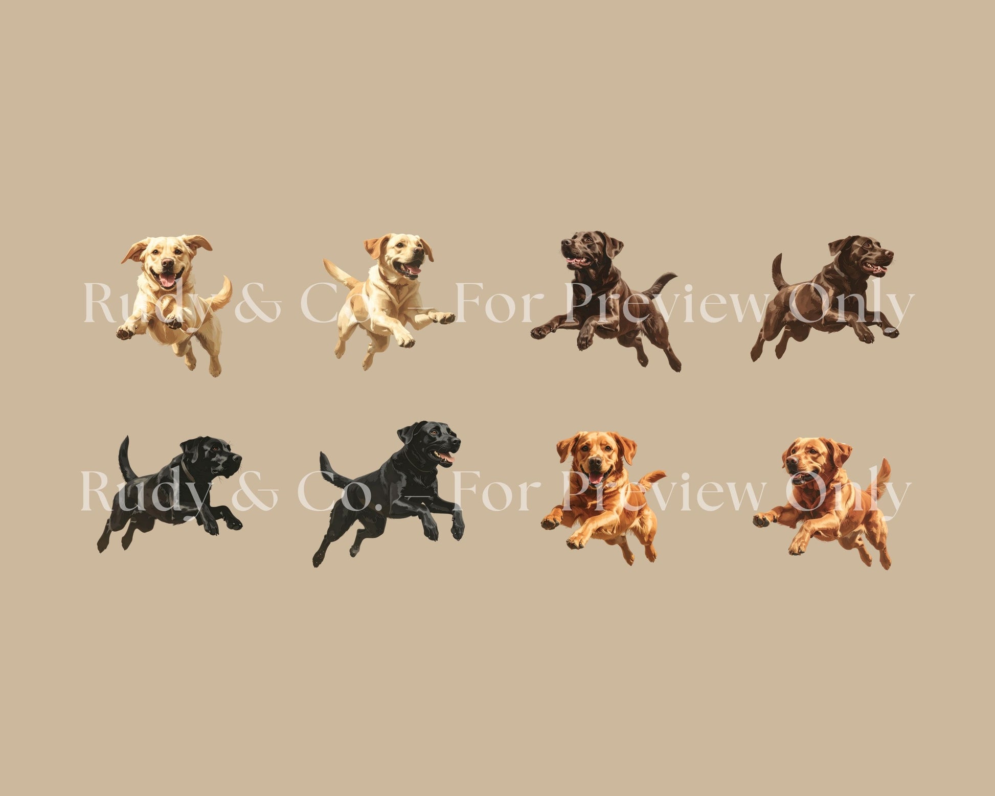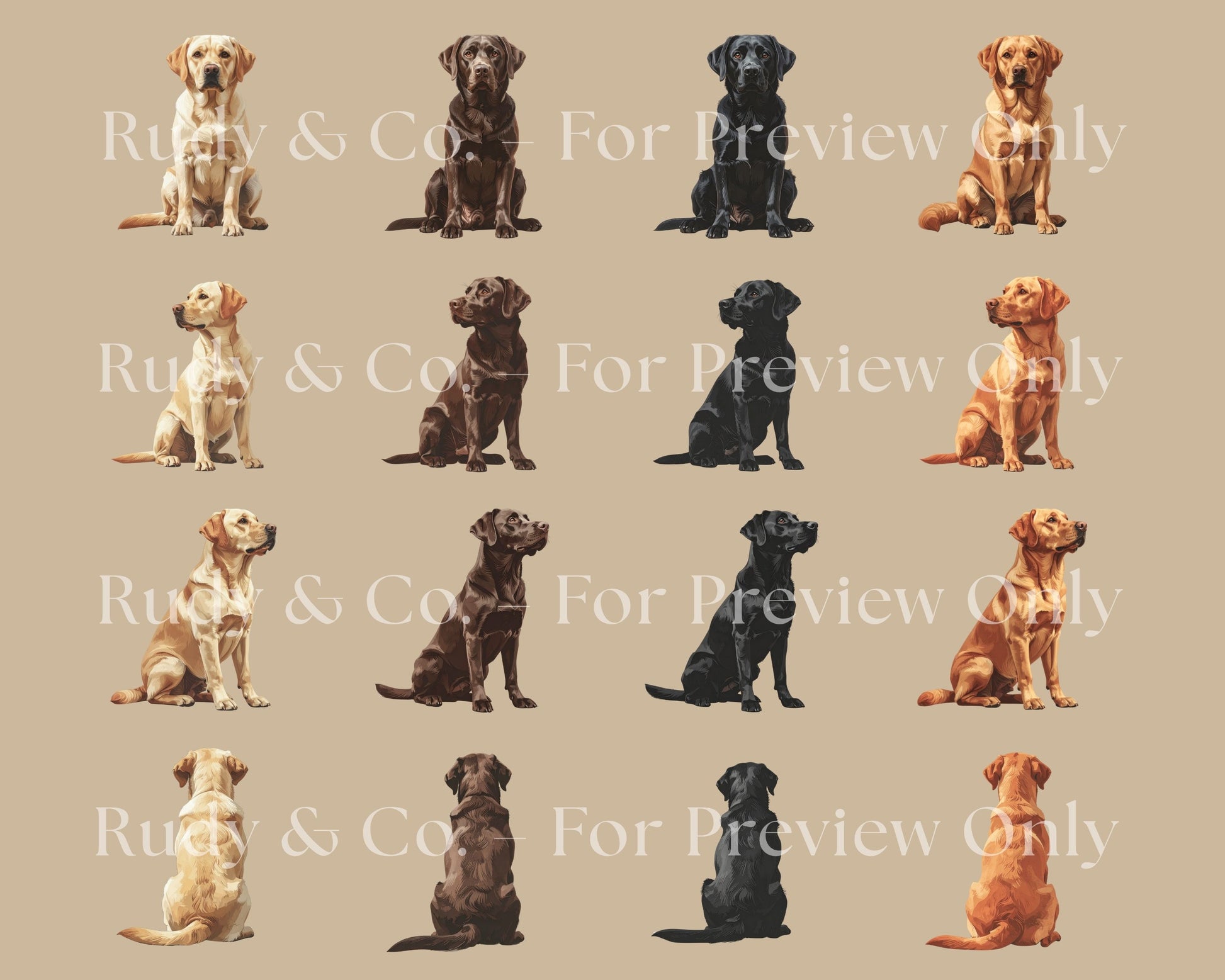 You’ll receive 44 high-quality PNG files (300 DPI, transparent background) featuring Yellow, Chocolate, Black, and Red Labradors — in a variety of poses including sitting, laying, side view, and more.