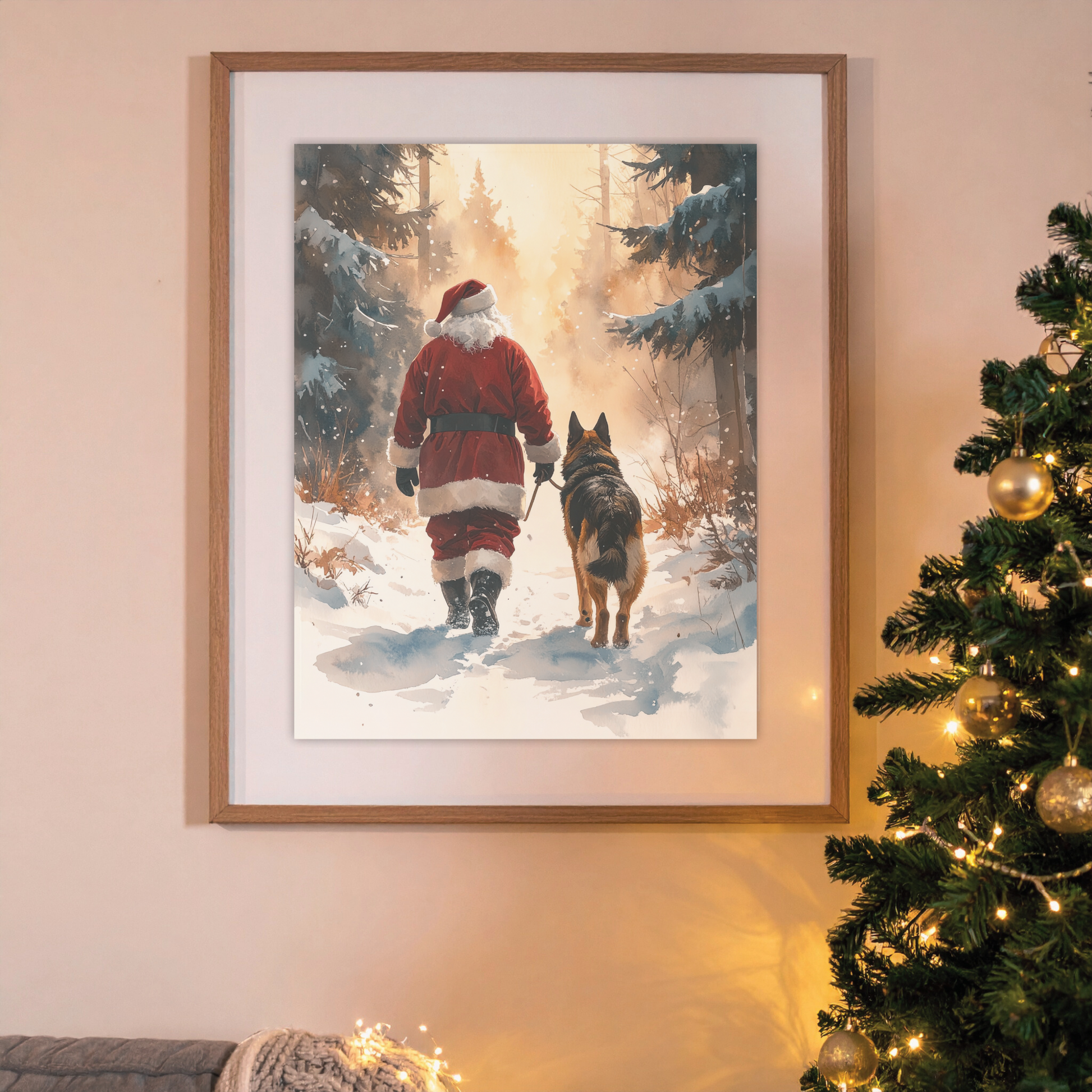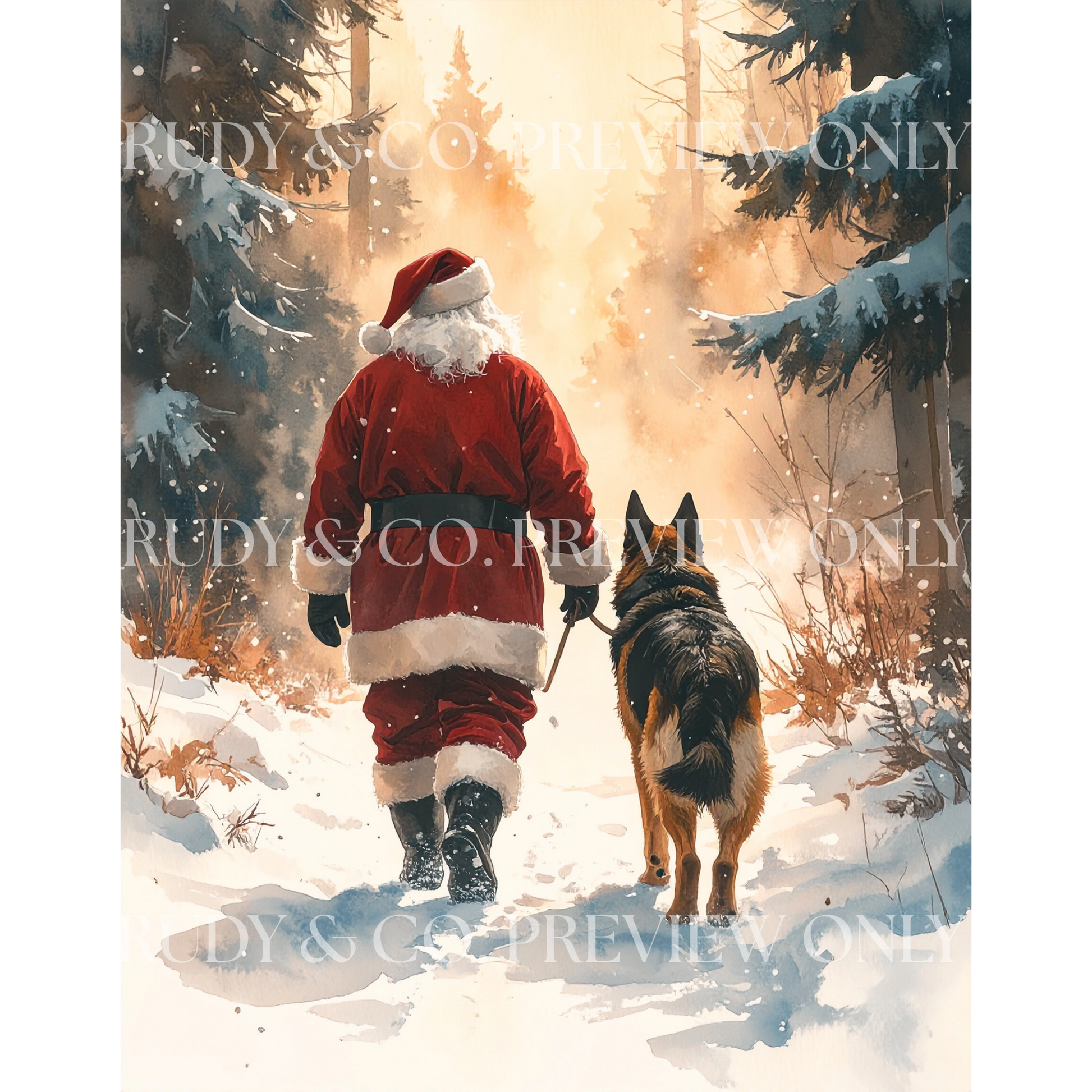 Featuring a soft watercolor-style scene of Santa walking beside his loyal German Shepherd, this festive artwork captures the calm and companionship of the season. Perfect for dog lovers, holiday decor, or anyone who believes Christmas feels better with a dog by their side.