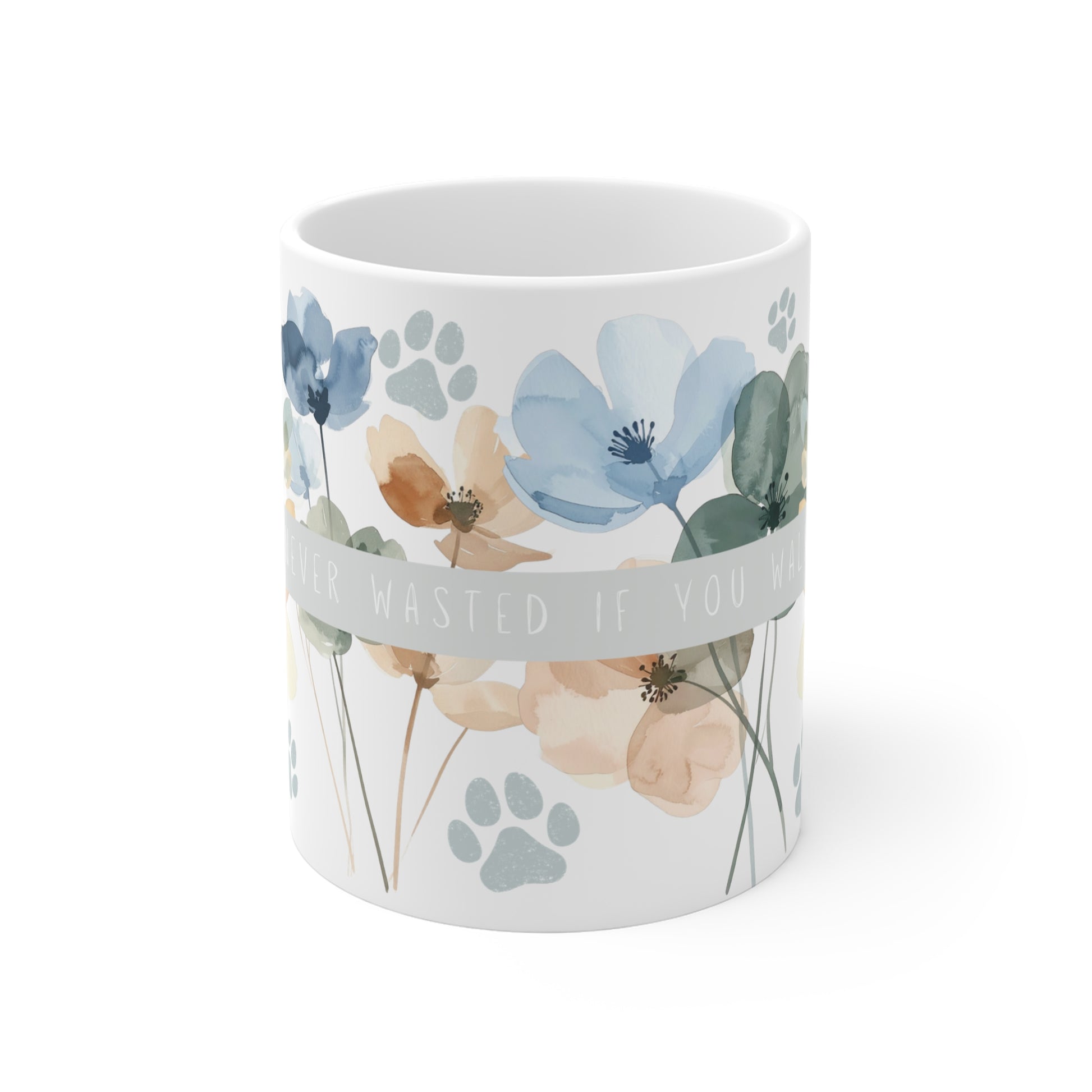 A calming dog lover mug designed to honour everyday routines with dogs. Featuring soft watercolour florals, subtle paw accents, and the gentle reminder “The Day’s Never Wasted If You Walked the Dog”, this ceramic mug brings warmth and reassurance to everyday moments.